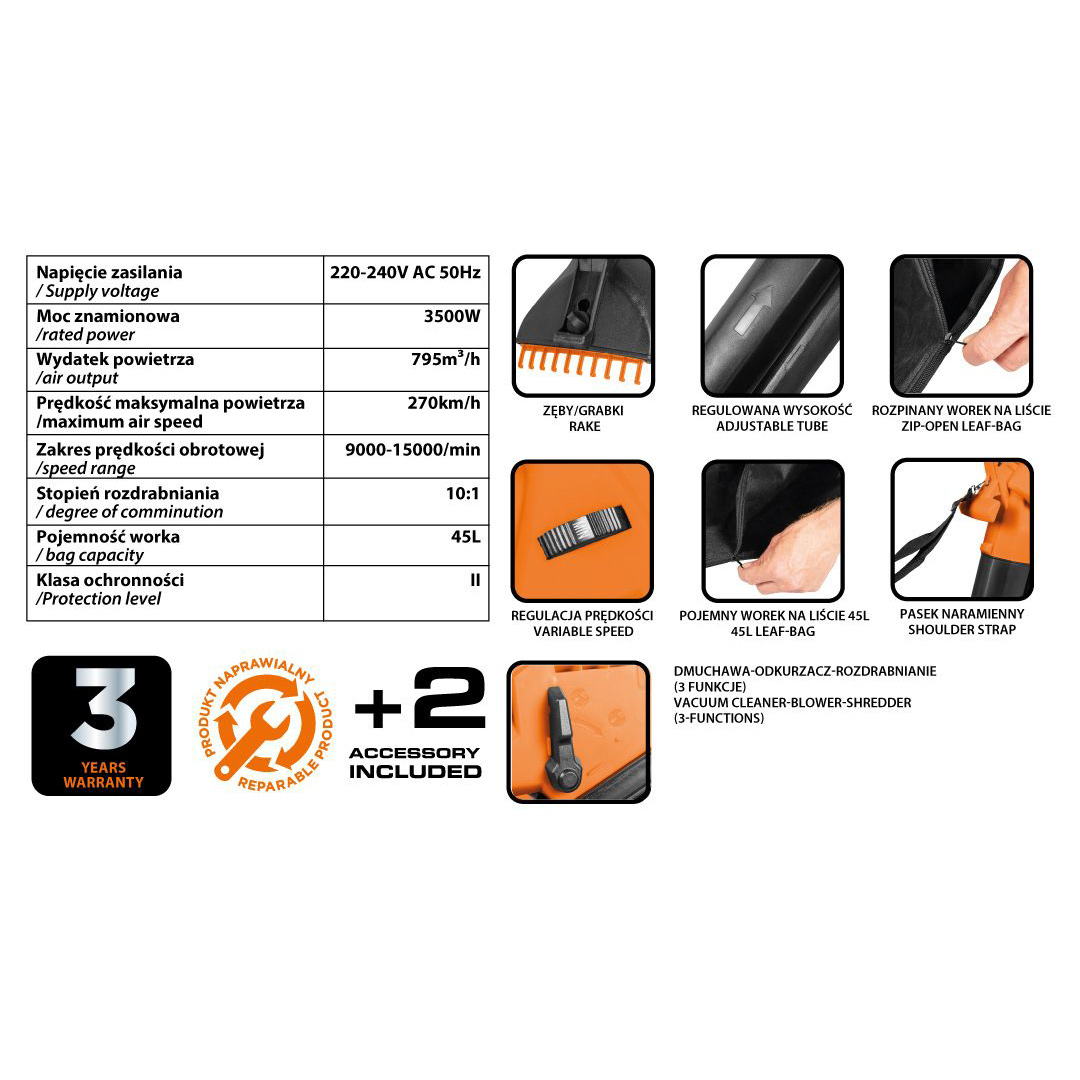 Motor snage 3500 W obezbeđuje visoke performanse, dok podesiv opseg obrtaja od 9.000 do 15.000 o/min omogućava prilagođavanje rada trenutnim potrebama. Brzina vazduha do 270 km/h garantuje lako uklanjanje čak i mokrog i teškog lišća, dok funkcija drobljenja sa odnosom 10:1 značajno smanjuje zapreminu prikupljenog otpada i olakšava njegovo odlaganje.